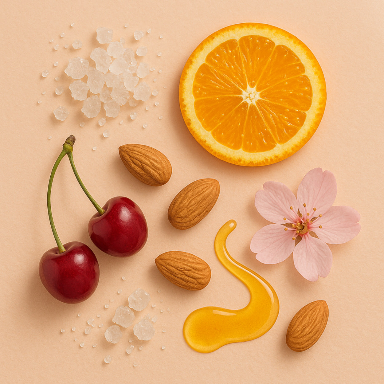 Формула: цукрові кристали полірують, Sweet Almond Oil зволожує, Guar Gum дає кремову текстуру, а прозора базa безпечно очищає й балансує pH.