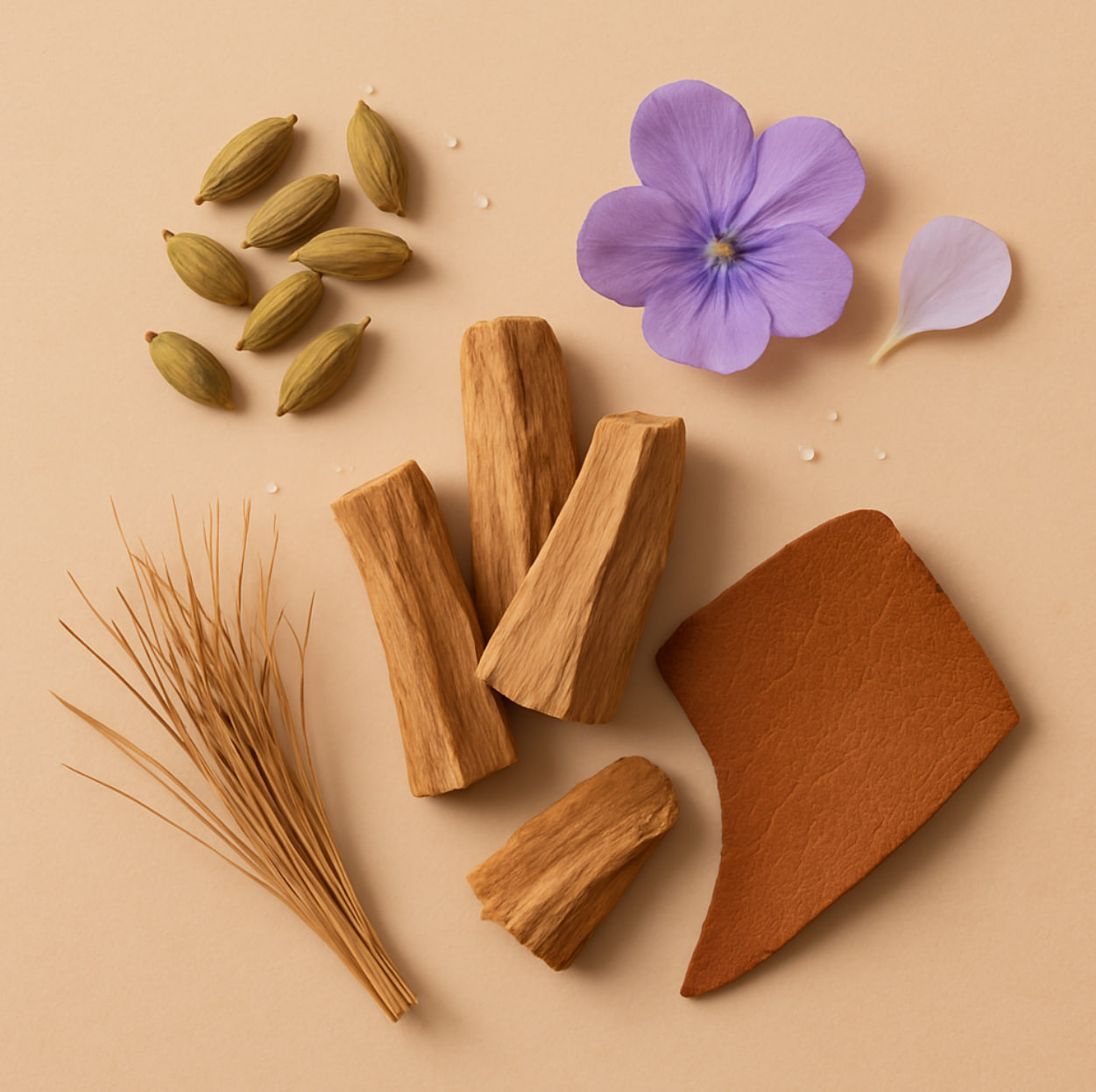 Opening glimmers with cardamom and green violet. The Heart unveils sandalwood and cedar. The Base settles into leather, amber and musk.